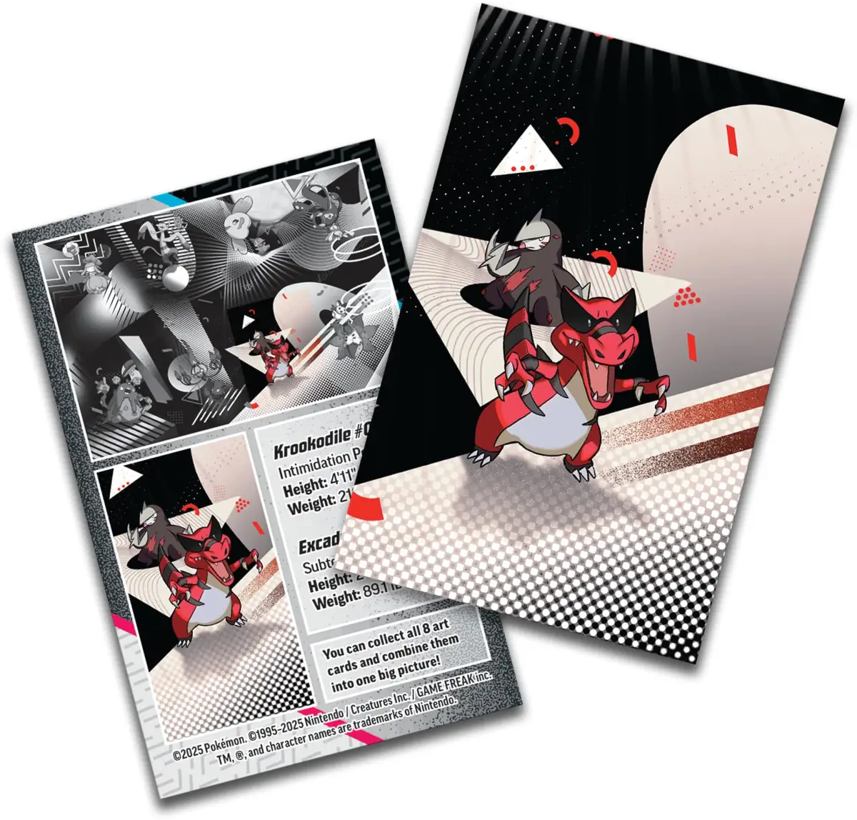 Notes: Krookodile & Excadrill (Unova Mini Tin) 2 booster packs (typically Scarlet & Violet—Black Bolt and White Flare), a sticker card, and a matching art card.